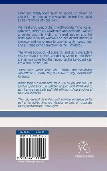 Here are twenty-seven tales so varied, so clever, so gentle in their humour you wouldn't believe they could all be crammed into one book. We meet prodigies, orphans, wolf-hounds, flying horses, gamblers, goddesses, academics and acrobats... we see a genius and his violin, a retired soldier and his restaurant, a young woman and her dentist (thrice), a teenager and her chance to save humanity (guess how) and a Damascene conversion in the Himalayas. The whole boborscht of scenarios and zany characters has the flavour of true storytelling about it. But there are serious notes too: the fingers on the keyboard can fire a gun... so read on! 'These short stories work well. Perhaps their outstanding characteristic is variety; they move over a large, multi-textured landscape. Indeed, there is a theme here, but it is in no way obtrusive. The function of this book is a collection of good short stories, and as such they are meaningful and valid, with many pleasing echoes of place and motivation. They also demonstrate a sharp and individual perception on the part of the author; these are vignettes, portraits, of remarkable potency and accuracy.' Mark Sykes.