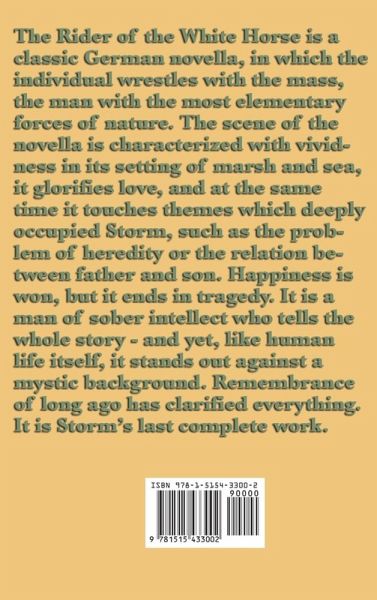 The Rider of the White Horse is a classic German novella, in which the individual wrestles with the mass, the man with the most elementary forces of nature. The scene of the novella is characterized with vividness in its setting of marsh and sea, it glorifies love, and at the same time it touches themes which deeply occupied Storm, such as the problem of heredity or the relation between father and son.