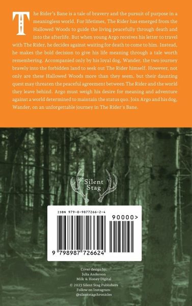 The Rider's Bane is a tale of bravery and the pursuit of purpose in a meaningless world. For lifetimes, The Rider has emerged from the Hallowed Woods to guide the living peacefully through death and into the afterlife. But when young Argo receives his letter to travel with The Rider, he decides against waiting for death to come to him. Instead, he makes the bold decision to give his life meaning through a tale worth remembering. Accompanied only by his loyal dog, Wander, the two journey bravely into the forbidden land to seek out The Rider himself. However, not only are these Hallowed Woods more than they seem, but their daunting quest may threaten the peaceful agreement between The Rider and the world they leave behind. Argo must weigh his desire for meaning and adventure against a world determined to maintain the status quo. Join Argo and his dog, Wander, on an unforgettable journey in The Rider's Bane.