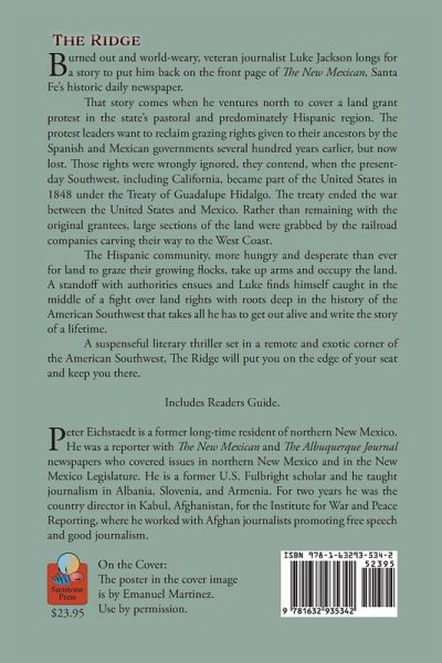 Burned out and world-weary, veteran journalist Luke Jackson longs for a story to put him back on the front page of The New Mexican, Santa Fe's historic daily newspaper. That story comes when he ventures north to cover a land grant protest in the state's pastoral and predominately Hispanic region. The protest leaders want to reclaim grazing rights given to their ancestors by the Spanish and Mexican governments several hundred years earlier, but now lost. Those rights were wrongly ignored, they contend, when the present-day Southwest, including California, became part of the United States in 1848 under the Treaty of Guadalupe Hidalgo. The treaty ended the war between the United States and Mexico. Rather than remaining with the original grantees, large sections of the land were grabbed by the railroad companies carving their way to the West Coast. he Hispanic community, more hungry and desperate than ever for land to graze their growing flocks, take up arms and occupy the land. A standoff with authorities ensues and Luke finds himself caught in the middle of a fight over land rights with roots deep in the history of the American Southwest that takes all he has to get out alive and write the story of a lifetime. A suspenseful literary thriller set in a remote and exotic corner of the American Southwest, The Ridge will put you on the edge of your seat and keep you there. Includes Readers Guide.
