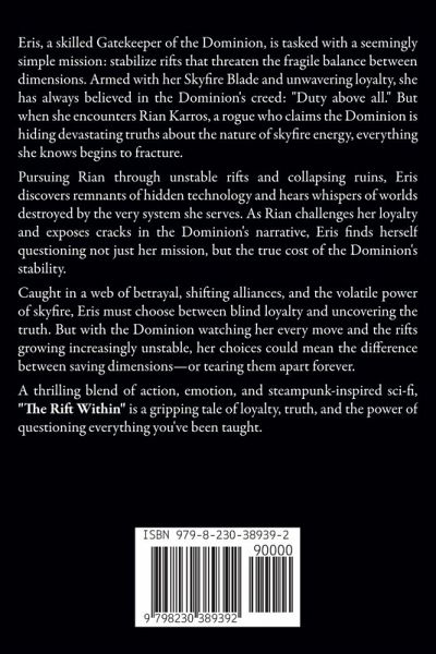 Eris, a skilled Gatekeeper of the Dominion, is tasked with a seemingly simple mission: stabilize rifts that threaten the fragile balance between dimensions. Armed with her Skyfire Blade and unwavering loyalty, she has always believed in the Dominion's creed: "Duty above all." But when she encounters Rian Karros, a rogue who claims the Dominion is hiding devastating truths about the nature of skyfire energy, everything she knows begins to fracture. Pursuing Rian through unstable rifts and collapsing ruins, Eris discovers remnants of hidden technology and hears whispers of worlds destroyed by the very system she serves. As Rian challenges her loyalty and exposes cracks in the Dominion's narrative, Eris finds herself questioning not just her mission, but the true cost of the Dominion's stability. Caught in a web of betrayal, shifting alliances, and the volatile power of skyfire, Eris must choose between blind loyalty and uncovering the truth. But with the Dominion watching her every move and the rifts growing increasingly unstable, her choices could mean the difference between saving dimensions-or tearing them apart forever. A thrilling blend of action, emotion, and steampunk-inspired sci-fi, "The Rift Within" is a gripping tale of loyalty, truth, and the power of questioning everything you've been taught.