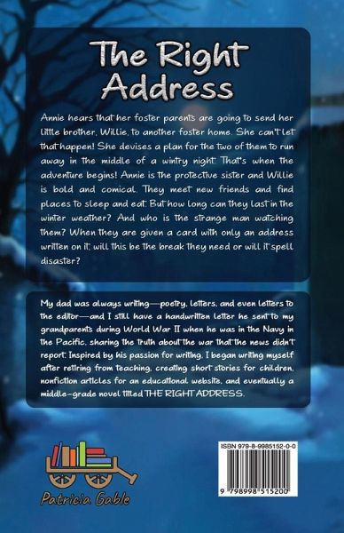 The Right Address by Patricia Gable Annie hears that her foster parents are going to send her little brother, Willie, to another foster home. She can't let that happen! She devises a plan for the two of them to run away in the middle of a wintry night. That's when the adventure begins! Annie is the protective sister and Willie is bold and comical. They meet new friends and find places to sleep and eat. But how long can they last in the winter weather? And who is the strange man watching them? When they are given a card with only an address written on it, will this be the break they need or will it spell disaster?