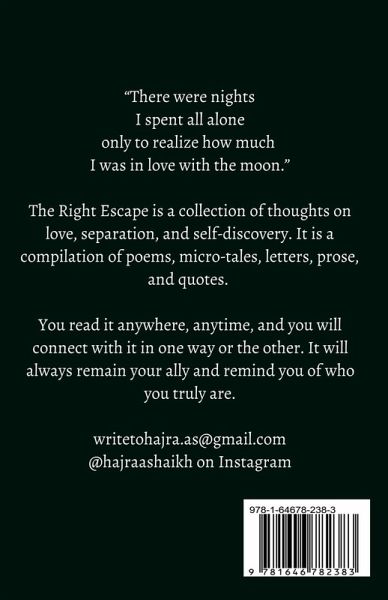 "There were nights I spent all alone only to realize how much I was in love with the moon." The Right Escape is a collection of thoughts on love, separation, and self-discovery. It is a compilation of poems, micro-tales, letters, prose, and quotes. You read it anywhere, anytime, and you will connect with it in one way or the other. It will always remain your ally and remind you of who you truly are.