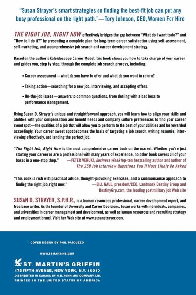The Right Job, Right Now effectively bridges the gap between "What do I want to do?" and "How do I do it?" by presenting a complete step-by-step plan for long-term career satisfaction using self-assessment, self-marketing, and a comprehensive job search and career development strategy. Based on the author's Kaleidoscope Career Model, this book shows you how to take charge of your career and takes you, step-by-step, through the complete job search process including: Career assessment - what do you have to offer and what do you want in return? Taking action - searching for a new job, interviewing, and accepting offers. On-the-job issues - answers to common questions from dealing with a bad boss to performance management Using her unique and straightforward approach you will learn how to align your skills and abilities with your compensation and benefit needs and company culture preferences to find your career sweet spot - the qualities of a job that will allow you to perform to the best of your abilities and be rewarded accordingly. Your career sweet spot becomes the basis of targeting a job search, writing resumes, taking advantage of technology, interviewing effectively, and landing the perfect job. Susan D. Strayer, SPHR, is a human resources professional, career development expert and freelance writer. As the founder of University and Career Decisions Susan works with individuals, companies and universities in career management and development; human resources and recruiting strategy and employment brand. Visit her website at www.susanstrayer.com.