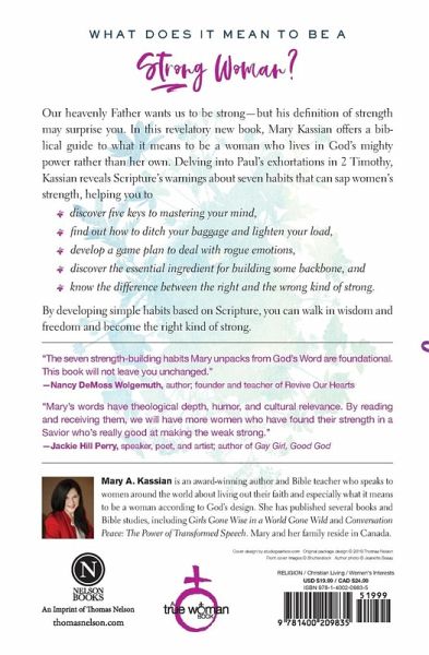 Award-winning author Mary Kassian provides readers a biblical guide to becoming the strong, resilient, capable women God created them to be. Our culture teaches us that it's important for women to be strong. The Bible agrees. Unfortunately, culture's idea of what makes a woman strong doesn't always align with the Bible's. As a result, Christians often have a skewed view of what constitutes strength. In The Right Kind of Strong, Mary Kassian delves into Paul's exhortation in 2 Timothy about the women of the church in Ephesus and uncovers warnings and truths about seven habits that can sap women's strength. She helps readers avoid these pitfalls by * carefully considering the people they allow into their lives, * taking control of their minds by taking every thought captive, * quickly and regularly confessing sin, * intentionally engaging their emotions, * living out what they're learning, * developing confident convictions, and * embracing their human weakness and leaning on the Lord. She reveals how, by implementing these seven habits, Christian women can walk in freedom and grow to be strong God's way.