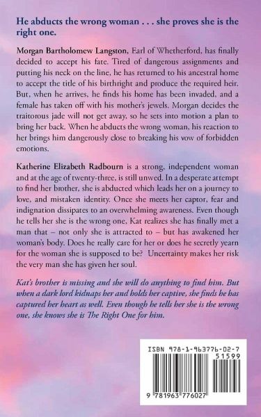 He abducts the wrong woman . . . she proves she is the right one. Morgan Bartholomew Langston, Earl of Whetherford, has finally decided to accept his fate. Tired of dangerous assignments and putting his neck on the line, he has returned to his ancestral home to accept the title of his birthright and produce the required heir. But, when he arrives, he finds his home has been invaded, and a female has taken off with his mother's jewels. Morgan decides the traitorous jade will not get away, so he sets into motion a plan to bring her back. When he abducts the wrong woman, his reaction to her brings him dangerously close to breaking his vow of forbidden emotions. Katherine Elizabeth Radbourn is a strong, independent woman and at the age of twenty-three, is still unwed. In a desperate attempt to find her brother, she is abducted which leads her on a journey to love, and mistaken identity. Once she meets her captor, fear and indignation dissipates to an overwhelming awareness. Even though he tells her she is the wrong one, Kat realizes she has finally met a man that - not only she is attracted to - but has awakened her woman's body. Does he really care for her or does he secretly yearn for the woman she is supposed to be? Uncertainty makes her risk the very man she has given her soul.