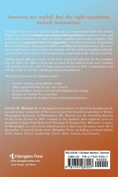 Creativity and innovation in your ministry begin with asking the right questions. Unlock the power of wise questioning with this essential guide for church leaders. Esteemed advisor Lovett H. Weems, Jr., compiled lists of leadership questions over many years, testing and analyzing them in local churches and other ministry settings. This book is the culmination of that careful work. It provides clusters of questions to help readers address their most perplexing ministry challenges. The questions are organized into 14 categories including Personnel, Expanding Reach and Impact, Management Skills, and Decision Making. Each set of questions is accompanied by guidance on when and how to use them effectively. The questions and other content are easy to grasp quickly, so you and your teams will see immediate benefit. And the questions apply in any denominational setting. Whether your congregation is large or small, these questions will steer you through critical issues with precision and insight. Elevate your leadership skills, spark creativity in your ministry, and find the answers you need to succeed. Begin by asking the right questions.