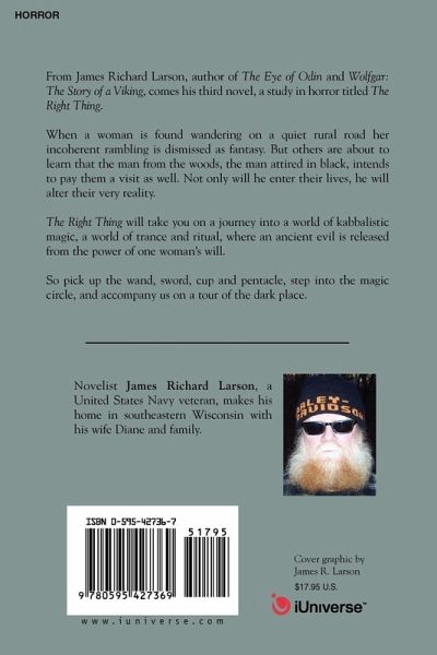 From James Richard Larson, author of The Eye of Odin and Wolfgar: The Story of a Viking, comes his third novel, a study in horror titled The Right Thing. When a woman is found wandering on a quiet rural road her incoherent rambling is dismissed as fantasy. But others are about to learn that the man from the woods, the man attired in black, intends to pay them a visit as well. Not only will he enter their lives, he will alter their very reality. The Right Thing will take you on a journey into a world of kabbalistic magic, a world of trance and ritual, where an ancient evil is released from the power of one woman's will. So pick up the wand, sword, cup and pentacle, step into the magic circle, and accompany us on a tour of the dark place.