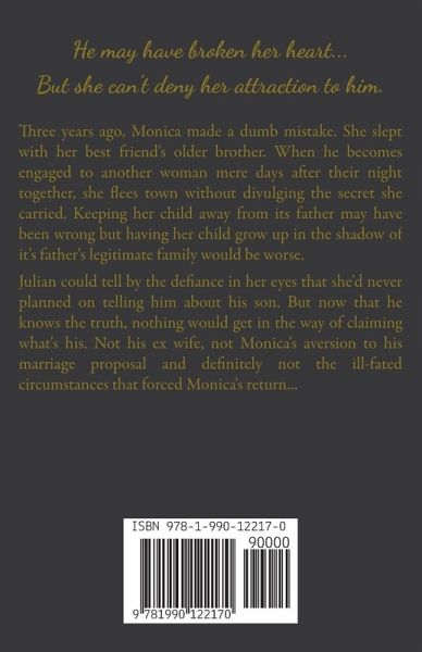 He may have broken her heart... But she can't deny her attraction to him. Three years ago, Monica made a dumb mistake. She slept with her best friend's older brother. When he becomes engaged to another woman mere days after their night together, she fleds town without divulging the secret she carried. Keeping her child away from its father may have been wrong but having her child grow up in the shadow of it's father's legitimate family would be worse. Julian could tell by the defiance in her eyes that she'd never planned on telling him about his son. But now that he knows the truth, nothing would get in the way of claiming what's his. Not his ex wife, not Monica's aversion to his marriage proposal and definitely not the ill-fated circumstances that forced Monica's return...