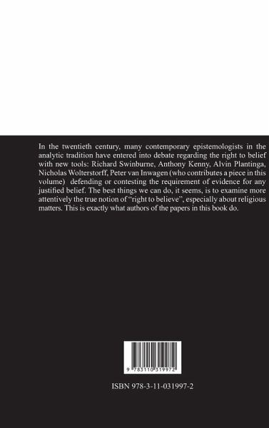 In the twentieth century, many contemporary epistemologists in the analytic tradition have entered into debate regarding the right to belief with new tools: Richard Swinburne, Anthony Kenny, Alvin Plantinga, Nicholas Wolterstorff, Peter van Inwagen (who contributes a piece in this volume) defending or contesting the requirement of evidence for any justified belief. The best things we can do, it seems, is to examine more attentively the true notion of "right to believe", especially about religious matters. This is exactly what authors of the papers in this book do.