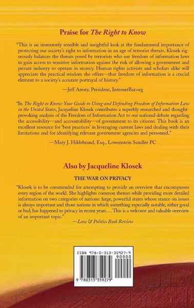 An attorney and certified information privacy professional offers a resource book for citizens seeking to understand, use, and defend their right to know under freedom of information laws in the United States. The Right to Know: Your Guide to Using and Defending Freedom of Information Law in the United States sets out in plain language freedom-of-information best practices for ordinary citizens, activist organizations, journalists, bloggers, and lawyers. Jacqueline Klosek, an expert in U.S. information law, educes practical lessons from dozens of case studies to show how readers can use freedom of information laws to protect themselves, but also to protect the environment, and public health and safety, as well as to expose governmental and corporate crime, waste, and corruption. Finally, the book shows American readers how, in contrast to what is going on in most democracies, their right to know is being progressively curtailed, why this is so dangerous to democracy, and what they can do to help reverse the alarming trend.