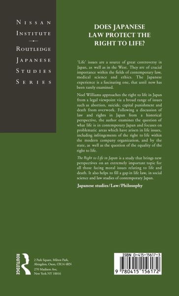 The Right to Life in Japan is a study that brings new perspectives to bear on an extremely important topic for all those facing the moral dilemmas of such issues as abortion and the death penalty. It also helps to fill a gap in life, in social science and law studies of contemporary Japan. Noel Williams approaches the right to life in Japan from a legal viewpoint via a broad range of issues such as abortion, suicide, capital punishment and death from overwork. Following a discussion of law and rights in Japan from an historical perspective, the author examines the question of what life is in contemporary Japan and focuses on problematic areas which have arisen in life issues, including infringements of the right to life within the modern company organization, and by the state, as well as the question of the equality of the right to life.