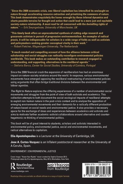 The Right to Nature explores the differing experiences of a number of environmental-social movements and struggles from the point of view of both activists and academics. This collection attempts to both document the social-ecological impacts of neoliberal attempts to exploit non-human nature in the post-crisis context and to analyse the opposition of emerging environmental movements and their demands for a radically different production of nature based on social needs and environmental justice. It also provides a necessary space for the exchange of ideas and experiences between academics and activists and aims to motivate further academic-activist collaborations around alternative and counter-hegemonic re-thinking of environmental politics.