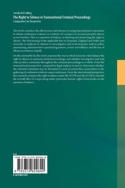 This book considers the effectiveness and fairness of using international cooperation to obtain confession evidence or evidence of a suspect or accused person's silence across borders. This is a question of balance in limiting and protecting the right to silence. The functioning of the applicable law in Denmark, England and Wales and Australia is analysed in relation to investigative and trial measures such as police questioning, administrative questioning powers, covert surveillance and the use of silence as evidence of guilt. On the national level, this work examines the way in which domestic rules balance the right to silence in national criminal proceedings, and whether investigative and trial rules produce continuity throughout the criminal proceedings as a whole. From the transnational perspective, comparative legal analysis is used to determine whether the national continuity may be disrupted to such an extent that cooperation in the gathering of confession evidence causesunfairness. From the international perspective, this research compares the right to silence under the ICCPR and the ECHR to identify the overall effect of cooperating under particular human rights frameworks on the question of balance.