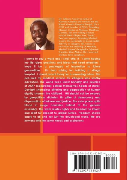 I came to say a word and I shall utter it. I write hoping my life dredges questions and ideas that need attention. I hope it to be a packaged of inspiration to future generations. It's to raise money for building a village hospital. I reveal today for all to learn from it for a rewarding future. This pell-mell towards medical service for the villager was worthy adventure. The world need know brutality and injustice incurred in current AK47 monarchies calling themselves heads of states. Daylight shameless pilfering and degradation of human dignity in our countries puts civilization to shame. The UN should not be swayed by geopolitical dictates. It's pillar of democracy and dispensation of fairness and justice. The veto power continues to spill blood in rouge countries defiant of the general assembly.This work relates right and freedom to inform and alert people to support global justice. Freedom should apply to all and not just the developed world.We are humans with the same needs and aspirations.