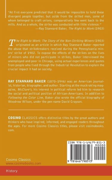 "At first everyone predicted that it would be impossible to hold these divergent people together, but aside from the skilled men, some of whom belonged to craft unions, comparatively few went back to the mills. And as a whole, the strike was conducted with little violence." -Ray Stannard Baker, The Right to Work(1903) The Right to Work: The Story of the Non-Striking Miners (1903) originated as an article in which Ray Stannard Baker reported the abuse that strikebreakers received during the miners' strike of 1903. To expose the effects of the strikes on the lives of miners who did not participate in strikes Baker interviewed the unemployed and poor in Chicago, using actual experiences and quotes from people who lived through the Industrial Revolution to explain the crucial impact it had on society.