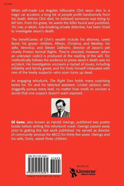 When self-made Los Angeles billionaire Clint Jason dies in a tragic car accident, a long list of people profit handsomely from his death. Before Clint died, he believed someone was trying to kill him. From his grave, he wants the killer found and punished. Tric Lee, a rakish, rule-breaking private detective, has been hired to investigate Jason's death. The beneficiaries of Clint's wealth include his attorney, Lewis Boné; his grown children, Allison, Christina, and Westley; his wife, Veronica; and Steven Dalheim, director of Jason's pet charity Protect Animal Rights. They're shocked, however, when an unknown codicil is produced at the reading of the will. Tric methodically follows the evidence to prove Jason's death was no accident. His investigation uncovers a myriad of issues, including infidelity and family greed, and Tric finds himself infatuated with one of the lovely suspects-who soon turns up dead. An engaging whodunit, The Right Turn holds many surprising twists for Tric and his talented assistant, Cricket Jackson, who doggedly pursue every lead, no matter how small, to uncover a secret that one suspect doesn't want exposed.