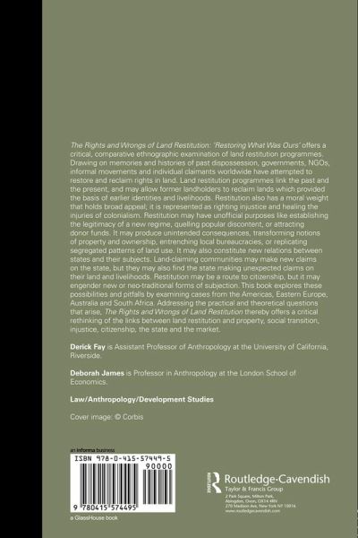The Rights and Wrongs of Land Restitution: 'Restoring What Was Ours' offers a critical, comparative ethnographic, examination of land restitution programs. Drawing on memories and histories of past dispossession, governments, NGOs, informal movements and individual claimants worldwide have attempted to restore and reclaim rights in land. Land restitution programs link the past and the present, and may allow former landholders to reclaim lands which provided the basis of earlier identities and livelihoods. Restitution also has a moral weight that holds broad appeal; it is represented as righting injustice and healing the injuries of colonialism. Restitution may have unofficial purposes, like establishing the legitimacy of a new regime, quelling popular discontent, or attracting donor funds. It may produce unintended consequences, transforming notions of property and ownership, entrenching local bureaucracies, or replicating segregated patterns of land use. It may also constitute new relations between states and their subjects. Land-claiming communities may make new claims on the state, but they may also find the state making unexpected claims on their land and livelihoods. Restitution may be a route to citizenship, but it may engender new or neo-traditional forms of subjection. This volume explores these possibilities and pitfalls by examining cases from the Americas, Eastern Europe, Australia and South Africa. Addressing the practical and theoretical questions that arise, The Rights and Wrongs of Land Restitution thereby offers a critical rethinking of the links between land restitution and property, social transition, injustice, citizenship, the state and the market.