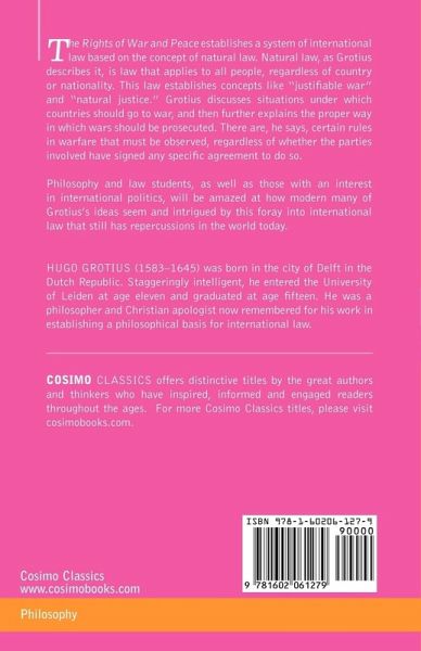 The Rights of War and Peace establishes a system of international law based on the concept of natural law. Natural law, as Grotius describes it, is law that applies to all people, regardless of country or nationality. This law establishes concepts like "justifiable war" and "natural justice." Grotius discusses situations under which countries should go to war, and then further explains the proper way in which wars should be prosecuted. There are, he says, certain rules in warfare that must be observed, regardless of whether the parties involved have signed any specific agreement to do so. Philosophy and law students, as well as those with an interest in international politics, will be amazed at how modern many of Grotius's ideas seem and intrigued by this foray into international law that still has repercussions in the world today. HUGO GROTIUS (1583-1645) was born in the city of Delft in the Dutch Republic. Staggeringly intelligent, he entered the University of Leiden at age eleven and graduated at age fifteen. He was a philosopher and Christian apologist now remembered for his work in establishing a philosophical basis for international law.