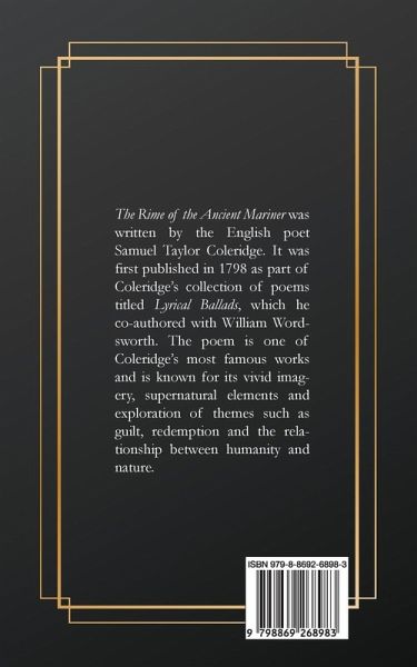 The Rime of the Ancient Mariner was written by the English poet Samuel Taylor Coleridge. It was first published in 1798 as part of Coleridge's collection of poems titled Lyrical Ballads, which he co-authored with William Wordsworth. The poem is one of Coleridge's most famous works and is known for its vivid imagery, supernatural elements and exploration of themes such as guilt, redemption and the relationship between humanity and nature.