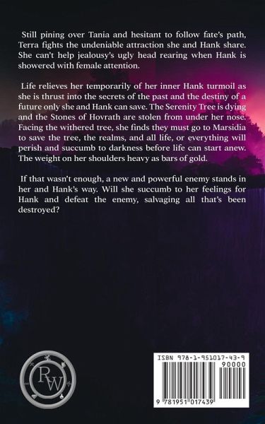 Still pining over Tania and hesitant to follow fate's path, Terra fights the undeniable attraction she and Hank share. She can't help jealousy's ugly head rearing when Hank is showered with female attention. Life relieves her temporarily of her inner Hank turmoil as she is thrust into the secrets of the past and the destiny of a future only she and Hank can save. The Serenity Tree is dying and the Stones of Hovrath are stolen from under her nose. Facing the withered tree, she finds they must go to Marsidia to save the tree, the realms, and all life, or everything will perish and succumb to darkness before life can start anew. The weight on her shoulders heavy as bars of gold. If that wasn't enough, a new and powerful enemy stands in her and Hank's way. Will she succumb to her feelings for Hank and defeat the enemy, salvaging all that's been destroyed?