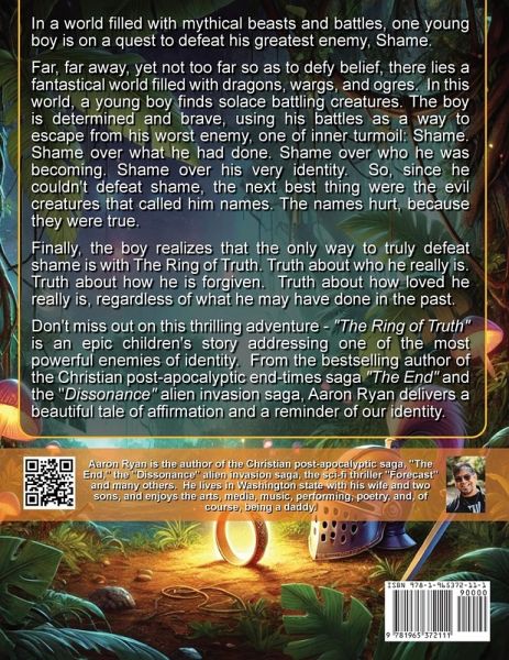 In a world filled with mythical beasts and battles, one young boy is on a quest to defeat his greatest enemy, Shame. Far, far away, yet not too far so as to defy belief, there lies a fantastical world filled with dragons, wargs, and ogres. In this world, a young boy finds solace battling creatures. The boy is determined and brave, using his battles as a way to escape from his worst enemy, one of inner turmoil: Shame. Shame over what he did. Shame over who he was becoming. Shame over his very identity. So, since he couldn't defeat shame, the next best thing were the evil creatures that called him names. The names hurt, because they were true. Finally, the boy realizes that the only way to truly defeat shame is with The Ring of Truth. Truth about who he really is. Truth about how he is forgiven. Truth about how loved he really is, regardless of what he may have done in the past. === Shame is a powerful enemy, and too many people, especially children, suffer from it. It is debilitating. This story was written from a Christian perspective to remind us of our true identity in Christ: forgiven, whole, and loved. If you have a loved one struggling with shame, please consider giving them a copy of this book, and reading this to your own children at bedtime. Shame can never vanquish The Truth. Don't miss out on this thrilling adventure - "The Ring of Truth" is an epic children's picture book addressing one of the most powerful enemies of identity: shame. From the bestselling author of the "Dissonance" sci-fi alien invasion saga and the sci-fi 9/11 historical fiction thriller "Forecast," Aaron Ryan delivers a beautiful tale of affirmation and a reminder of our identity. Buy now before the price changes!