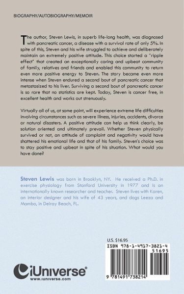 The author, Steven Lewis, in superb life-long health, was diagnosed with pancreatic cancer, a disease with a survival rate of only 5%. In spite of this, Steven and his wife struggled to achieve and deliberately maintain an extremely positive attitude. This choice started a "ripple effect" that created an exceptionally caring and upbeat community of family, relatives and friends and enabled this community to return even more positive energy to Steven. The story became even more intense when Steven endured a second bout of pancreatic cancer that metastasized to his liver. Surviving a second bout of pancreatic cancer is so rare that no statistics are kept. Today, Steven is cancer free, in excellent health and works out strenuously. Virtually all of us, at some point, will experience extreme life difficulties involving circumstances such as severe illness, injuries, accidents, divorce or natural disasters. A positive attitude can help us think clearly, be solution oriented and ultimately prevail. Whether Steven physically survived or not, an attitude of complaint and negativity would have shattered his emotional life and that of his family. Steven's choice was to stay positive and upbeat in spite of his situation. What would you have done?