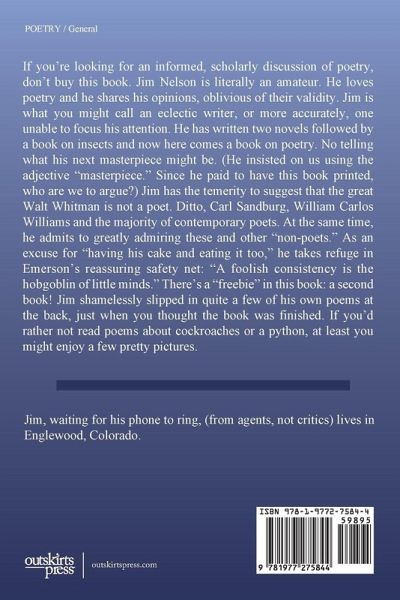 If you're looking for an informed, scholarly discussion of poetry, don't buy this book. Jim Nelson is literally an amateur. He loves poetry and he shares his opinions, oblivious of their validity. Jim is what you might call an eclectic writer, or more accurately, one unable to focus his attention. He has written two novels followed by a book on insects and now here comes a book on poetry. No telling what his next masterpiece might be. (He insisted on us using the adjective "masterpiece." Since he paid to have this book printed, who are we to argue?) Jim has the temerity to suggest that the great Walt Whitman is not a poet. Ditto, Carl Sandburg, William Carlos Williams and the majority of contemporary poets. At the same time, he admits to greatly admiring these and other "non-poets." As an excuse for "having his cake and eating it too," he takes refuge in Emerson's reassuring safety net: "A foolish consistency is the hobgoblin of little minds." There's a "freebie" in this book: a second book! Jim shamelessly slipped in quite a few of his own poems at the back, just when you thought the book was finished. If you'd rather not read poems about cockroaches or a python, at least you might enjoy a few pretty pictures.
