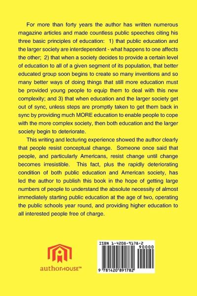 For more than forty years the author has written numerous magazine articles and made countless public speeches citing his three basic principles of education: 1) that public education and the larger society are interdependent - what happens to one affects the other; 2) that when a society decides to provide a certain level of education to all of a given segment of its population, that better educated group soon begins to create so many inventions and so many better ways of doing things that still more education must be provided young people to equip them to deal with this new complexity; and 3) that when education and the larger society get out of sync, unless steps are promptly taken to get them back in sync by providing much MORE education to enable people to cope with the more complex society, then both education and the larger society begin to deteriorate. This writing and lecturing experience showed the author clearly that people resist conceptual change. Someone once said that people, and particularly Americans, resist change until change becomes irresistible. This fact, plus the rapidly deteriorating condition of both public education and American society, has led the author to publish this book in the hope of getting large numbers of people to understand the absolute necessity of almost immediately starting public education at the age of two, operating the public schools year round, and providing higher education to all interested people free of charge.