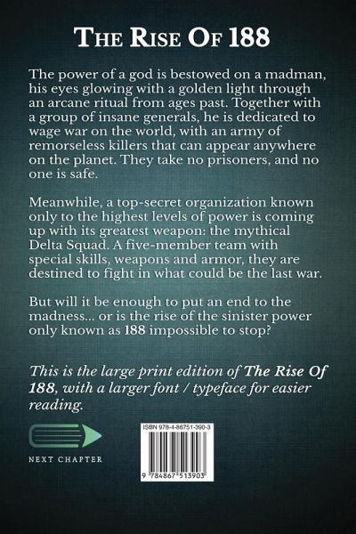 The power of a god is bestowed on a madman, his eyes glowing with a golden light through an arcane ritual from ages past. Together with a group of insane generals, he is dedicated to wage war on the world, with an army of remorseless killers that can appear anywhere on the planet. They take no prisoners, and no one is safe. Meanwhile, a top-secret organization known only to the highest levels of power is coming up with its greatest weapon: the mythical Delta Squad. A five-member team with special skills, weapons and armor, they are destined to fight in what could be the last war. But will it be enough to put an end to the madness... or is the rise of the sinister power only known as 188 impossible to stop? This is the large print edition of The Rise Of 188, with a larger font / typeface for easier reading.
