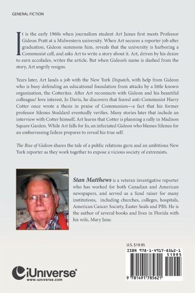 It is the early 1960s when journalism student Art James first meets Professor Gideon Pratt at a Midwestern university. When Art secures a reporter job after graduation, Gideon summons him, reveals that the university is harboring a Communist cell, and asks Art to write a story about it. Art, driven by his desire to earn accolades, writes the article. But when Gideon's name is slashed from the story, Art angrily resigns. Years later, Art lands a job with the New York Dispatch, with help from Gideon who is busy defending an educational foundation from attacks by a little known organization, the Cotterites. After Art reconnects with Gideon and his beautiful colleague/ love interest, Jo Davis, he discovers that feared anti-Communist Harry Cotter once wrote a thesis in praise of Communism-a fact that his former professor Silenus Stoddard eventually verifies. Many stories later that include an interview with Cotter himself, Art learns that Cotter is planning a rally in Madison Square Garden. While Art falls for Jo, an infuriated Gideon who blames Silenus for an embarrassing failure prepares to reveal his true self. The Rise of Gideon shares the tale of a public relations guru and an ambitious New York reporter as they work together to expose a vicious society of extremists.