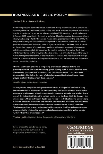 Combining insights from international relations theory with institutional approaches from organization theory and public policy, this book provides a complete explanation for the adoption of corporate social responsibility (CSR), showing how global norms influenced CSR adoption in the mining industry. Global normative developments have clearly had an important influence on major mining companies: by the mid-2000s, the majority had adopted sustainable development as a normative frame for their CSR policies and practices. However, there is significant variation between firms in terms of the timing, degree of commitment, and the willingness to assume a leadership role in promoting global standards for the mining industry. The author finds that attributes internal to the firm, including the critical role of leadership, and the way in which management responds to the institutional context and operational challenges faced in different countries are important influences on CSR adoption and important factors explaining variation.