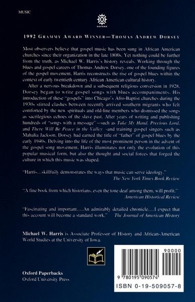 Most observers believe that gospel music has been sung in African American churches since their organization in the late 1800s. Yet nothing could be further from the truth, as Michael W. Harris's history reveals. Working through the blues and gospel movement. Harris reconstructs the rise of gospel blues within the context of early twentieth century African American cultural history. After a nervous breakdown and a subsequent religious conversion in 1928. Dorsey began to write gospel songs with blues accompaniments. His introduction of these "goals" into Chicago's Afro-Baptist churches during the 1930s stirred clashes between recently arrived southern migrants who felt comforted by the new spirituals and old-line members who dismissed the songs as sacrilegious echoes of the slave past. After years of writing and publishing hudnreds of "songs with a message"-- such as "Take My Hand", "Precious Lord", and "There Will Be Peace in the Valley"-- and training gospel singers such as Mahalia Jackson, Dorsey had earned the title of "father" of gospel blues by the early 1940s. Delving into the life of the most prominent person in the advent of the gospel song movement. Harris illuminates not only the evolution of this popular musical form, but also the thought and social forces that forged the culture in which this music was shaped.
