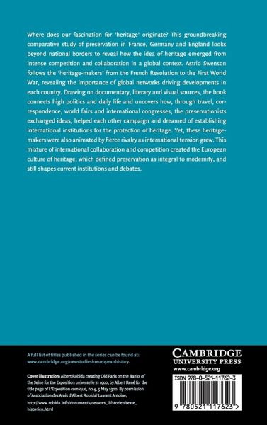 Where does our fascination for 'heritage' originate? This groundbreaking comparative study of preservation in France, Germany and England looks beyond national borders to reveal how the idea of heritage emerged from intense competition and collaboration in a global context. Astrid Swenson follows the 'heritage-makers' from the French Revolution to the First World War, revealing the importance of global networks driving developments in each country. Drawing on documentary, literary and visual sources, the book connects high politics and daily life and uncovers how, through travel, correspondence, world fairs and international congresses, the preservationists exchanged ideas, helped each other campaign and dreamed of establishing international institutions for the protection of heritage. Yet, these heritage-makers were also animated by fierce rivalry as international tension grew. This mixture of international collaboration and competition created the European culture of heritage, which defined preservation as integral to modernity, and still shapes current institutions and debates.