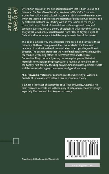 In this unique and dramatic account of the rise of neoliberalism Howard and King consider the major features of historical materialism, the factors which resulted in 19th and 20th century thinkers incorrectly predicting the long-term decline of the market, and the prospects for a reversal of neoliberalism in the 21st century.