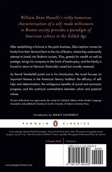 William Dean Howells' richly humorous characterization of a self-made millionaire in Boston society provides a paradigm of American culture in the Gilded Age. After establishing a fortune in the paint business, Silas Lapham moves his family from their Vermont farm to the city of Boston, where they awkwardly attempt to break into Brahmin society. Silas, greedy for wealth as well as prestige, brings his company to the brink of bankruptcy, and the family is forced to return to Vermont, financially ruined but morally renewed. As Kermit Vanderbilt points out in his introduction, the novel focuses on important themes in the American literary tradition: the efficacy of self-help and determination, the ambiguous benefits of social and economic progress, and the continual contradiction between urban and pastoral values. For more than seventy years, Penguin has been the leading publisher of classic literature in the English-speaking world. With more than 1,700 titles, Penguin Classics represents a global bookshelf of the best works throughout history and across genres and disciplines. Readers trust the series to provide authoritative texts enhanced by introductions and notes by distinguished scholars and contemporary authors, as well as up-to-date translations by award-winning translators.