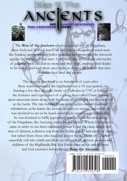 Starting a few days after the battle of Culloden in 1747, this book follows the fortunes and experiences of a young Scot called Ewan thrown upon uncertain times along with his mum, after his dad and brothers fell at the battle. The tale follows Ewan as he tackles untold trials and tribulations, as he learns the lessons he must to survive and which he was destined to use as he heads unwittingly towards a prophecy that he was destined to fulfil, a prophecy that foretold the awakeningof the Fingalians, the Ancients, under his leadership. Whom Ewan has to unite in order to use their combined power to aid the clans during this time of distress, A distress not from the feeble greed's and needs of man, but rather from those who lead and posses them. Those of a higher unearthly evil who relish and bloat on the souls of all men, women and children of the Highlands, But first Ewan must tackle untold beast and foul creatures before he can Raise the Ancients.