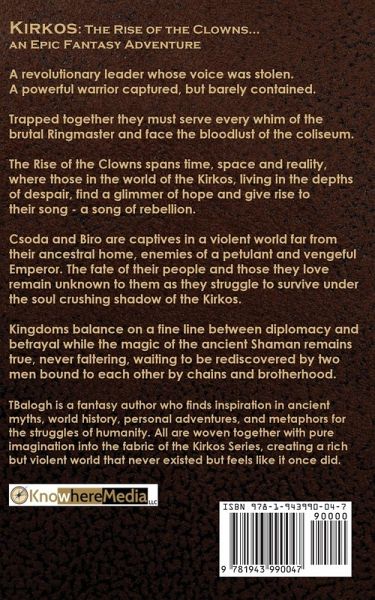A revolutionary leader whose voice was stolen. A powerful warrior captured, but barely contained. Trapped together they must serve every whim of the brutal Ringmaster and face the bloodlust of the coliseum. The Rise of the Clowns spans time, space and reality, where those in the world of the Kirkos, living in the depths of despair, find a glimmer of hope and give rise to their song - a song of rebellion. Csoda and Biro are captives in a violent world far from their ancestral home, enemies of a petulant and vengeful Emperor. The fate of their people and those they love remain unknown to them as they struggle to survive under the soul crushing shadow of the Kirkos. Kingdoms balance on a fine line between diplomacy and betrayal while the magic of the ancient Shaman remains true, never faltering, waiting to be rediscovered by two men bound to each other by chains and brotherhood. The Rise of the Clowns blends myth and legend, action and adventure, magic and the power of the human spirit, for a thrilling fantasy ride like no other.