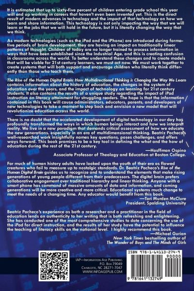 It is estimated that up to sixty-five percent of children entering grade school this year will end up working in careers that have yet to be created. This is a result, in part, of the rapid advances in technology that have occurred since Apple introduced the iPhone just ten years ago. This technology is not only impacting the way that we learn or the jobs that we will hold in the future, but it is literally changing the way that we think. As modern technologies are introduced during formative periods of brain development, they are having an impact on traditionally linear patterns of thought. Today's youth no longer process information in the same linear fashion as past generations. This is creating confusion in educational settings that are specifically designed to meet the needs of linear thinkers. Administrators, educators, and parents must learn to better understand these changes in order to create models that will be viable for 21st century learners. We must work together to create systems that will both support and encourage children who literally think differently than those who teach them. The Rise of the Human Digital Brain: How Multidirectional Thinking is Changing the Way We Learn contains information about the history of education, the changes in the systems of education over the years, and the impact of technology on learning for 21st century students. It also contains the results of a unique study regarding the impact of iPad instruction on literacy attainment for struggling readers. The hope is that the information contained in this book will cause administrators, educators, parents, and developers of new technologies to take a moment to step back and envision a new model that will revolutionize education across the world.