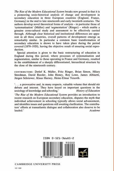 The Rise of the Modern Educational System breaks new ground in that it is a pioneering socio-historical analysis of change and development in secondary education in three European countries (England, France, Germany) in the mid to late nineteenth and early twentieth centuries. The authors develop novel theoretical forms of analysis -- in particular those of 'systematisation' (Muller) and 'segmentation' (Ringer) -- which enable a genuine cross-cultural study and assessment to be effectively carried through. Although clear historical and institutional differences are apparent in all three countries, overall patterns of development emerge as remarkably similar. In particular a common basic transformation of secondary education is shown to have taken place during the period covered (1870-1920), having the objective result of ensuring social reproduction. Special attention is given to the basic restructuring of education in England during this period, where processes of systematisation and segmentation, similar to those operating in France and Germany, resulted in the establishment of a sharply differentiated, hierarchical structure by the close of the nineteenth century.