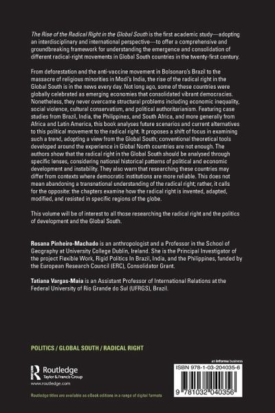 From deforestation and the anti-vaccine movement in Bolsonaro's Brazil to the massacre of religious minorities in Modi's India, the rise of the radical right in the Global South is in the news every day. Not long ago, some of these countries were globally celebrated as emerging economies that consolidated vibrant democracies. Nonetheless, they never overcame structural problems including economic inequality, social violence, cultural conservatism, and political authoritarianism. Featuring case studies from Brazil, India, the Philippines, and South Africa, and more generally from Africa and Latin America, this book analyses future scenarios and current alternatives to this political movement to the radical right. It proposes a shift of focus in examining such a trend, adopting a view from the Global South; conventional theoretical tools developed around the experience in Global North countries are not enough. The authors show that the radical right in the Global South should be analysed through specific lenses, considering national historical patterns of political and economic development and instability. They also warn that researching these countries may differ from contexts where democratic institutions are more reliable. This does not mean abandoning a transnational understanding of the radical right; rather, it calls for the opposite: the chapters examine how the radical right is invented, adapted, modified, and resisted in specific regions of the globe.