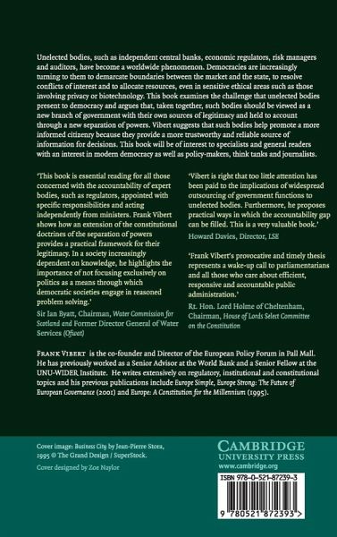 Unelected bodies, such as independent central banks, economic regulators, risk managers and auditors have become a worldwide phenomenon. Democracies are increasingly turning to them to demarcate boundaries between the market and the state, to resolve conflicts of interest and to allocate resources, even in sensitive ethical areas such as those involving privacy or biotechnology. This book examines the challenge that unelected bodies present to democracy and argues that, taken together, such bodies should be viewed as a new branch of government with their own sources of legitimacy and held to account through a new separation of powers. Vibert suggests that such bodies help promote a more informed citizenry because they provide a more trustworthy and reliable source of information for decisions. This book will be of interest to specialists and general readers with an interest in modern democracy as well as policy makers, think tanks and journalists.