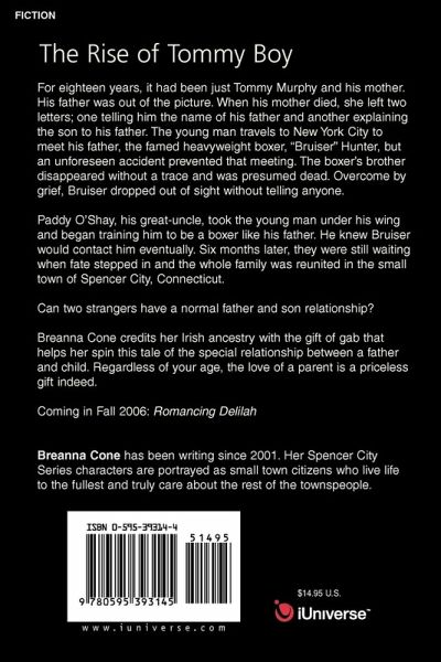 For eighteen years, it had been just Tommy Murphy and his mother. His father was out of the picture. When his mother died, she left two letters; one telling him the name of his father and another explaining the son to his father. The young man travels to New York City to meet his father, the famed heavyweight boxer, "Bruiser" Hunter, but an unforeseen accident prevented that meeting. The boxer's brother disappeared without a trace and was presumed dead. Overcome by grief, Bruiser dropped out of sight without telling anyone. Paddy O'Shay, his great-uncle, took the young man under his wing and began training him to be a boxer like his father. He knew Bruiser would contact him eventually. Six months later, they were still waiting when fate stepped in and the whole family was reunited in the small town of Spencer City, Connecticut. Can two strangers have a normal father and son relationship? Breanna Cone credits her Irish ancestry with the gift of gab that helps her spin this tale of the special relationship between a father and child. Regardless of your age, the love of a parent is a priceless gift indeed. Coming in Fall 2006: Romancing Delilah