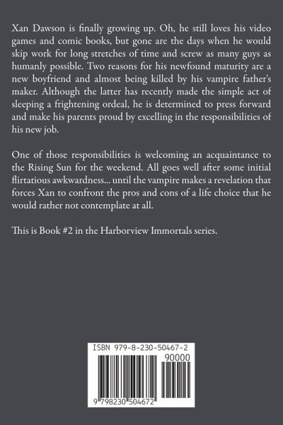 Xan Dawson is finally growing up. Oh, he still loves his video games and comic books, but gone are the days when he would skip work for long stretches of time and screw as many guys as humanly possible. Two reasons for his newfound maturity are a new boyfriend and almost being killed by his vampire father's maker. Although the latter has recently made the simple act of sleeping a frightening ordeal, he is determined to press forward and make his parents proud by excelling in the responsibilities of his new job. One of those responsibilities is welcoming an acquaintance to the Rising Sun for the weekend. All goes well after some initial flirtatious awkwardness... until the vampire makes a revelation that forces Xan to confront the pros and cons of a life choice that he would rather not contemplate at all. This is Book #2 in the Harborview Immortals series.