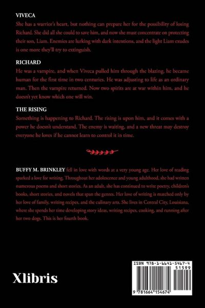VIVECA She has a warrior's heart, but nothing can prepare her for the possibility of losing Richard. She did all she could to save him, and now she must concentrate on protecting their son, Liam. Enemies are lurking with dark intentions, and the light Liam exudes is one more they'll try to extinguish. RICHARD He was a vampire, and when Viveca pulled him through the blazing, he became human for the first time in two centuries. He was adjusting to life as an ordinary man. Then the vampire returned. Now two spirits are at war within him, and he doesn't yet know which one will win. THE RISING Something is happening to Richard. The rising is upon him, and it comes with a power he doesn't understand. The enemy is waiting, and a new threat may destroy everyone he loves if he cannot learn to control it in time.