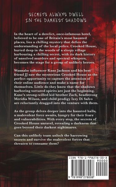 In the heart of a derelict, once-infamous hotel, believed to be one of Britain's most haunted places, lies a chilling mystery that defies the understanding of the local police. Crooked House, buried deep in the woods of a sleepy village harbouring a chilling secret, with its dark history of unsolved murders and spectral whispers, becomes the stage for a group of unlikely heroes. Wannabe influencer Kane Jackson and his best friend JJ saw the mysterious Crooked House as the perfect opportunity to capture the attention of their online audience and make a name for themselves. Little do they know that the shadows harboring tortured spirits are just the beginning. Kane's strong-willed kid brother Zach, headstrong Meridia Wilson, and child prodigy Izzy Di Salvo are reluctantly dragged into the venture with them. As the group delves deeper into the haunted halls, a malevolent force awaits, hungry for their fears and vulnerabilities. With every step, the secrets of Crooked House unravel, revealing a darkness that goes beyond their darkest nightmares. Can this unlikely team unlock the harrowing secrets and survive the malevolent forces that threaten to consume them?