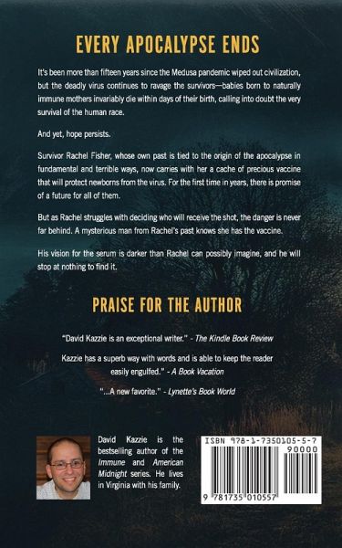 EVERY APOCALYPSE ENDS It's been fifteen years since the Medusa pandemic wiped out civilization, but the deadly virus continues to ravage the survivors - babies born to naturally immune mothers invariably die within days of their birth, calling into doubt the very survival of the human race. And yet, hope persists. Survivor Rachel Fisher, whose own past is tied to the origin of the apocalypse in fundamental and terrible ways, now carries with her a cache of precious vaccine that will protect newborns from the virus. For the first time in years, there is promise of a future for all of them. But as Rachel struggles with deciding who will receive the shot, the danger is never far behind. A mysterious man from Rachel's past knows she has the vaccine. His vision for the serum is darker than Rachel can possibly imagine, and he will stop at nothing to find it. The thrilling conclusion to the IMMUNE series!
