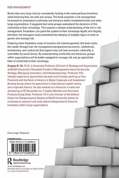 This book posits that banks, by conforming to the actions and standards of other banks, actually run high risks. It presents a framework that uses four packages of constructs and organizational logic to understand conformity and deviance within investment banks and other large organizations. Featuring eight case studies of massive risk mismanagement, it walks the reader through the four conceptual perspectives on risk that might explain why and how economic rationality was overridden by social forces. By understanding conformity and deviance, groups within organizations will be better equipped to manage risk and go against the tides of conformity to their advantage.