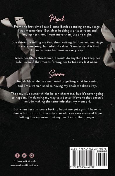 Micah From the first time I saw Sienna Bardot dancing on my stage, I was mesmerized. But after booking a private room and buying her time, I want more than just one night. She thinks by telling me that she's waiting for love and marriage it'll scare me away, but what she doesn't understand is that I plan to make her mine in every way. When her life is threatened, I would do anything to keep her safe-even if that means forcing her to take my last name. Sienna Micah Alexander is a man used to getting what he wants, and I'm a woman used to having my choices taken away. The sexy club owner thinks he can charm me, but it's never going to happen. I'm dancing my way to a better life-one that doesn't include making the same mistakes my mom did. But when her sins come back to haunt me yet again, I have no choice but to turn to the only man who can save me-and hope letting him in doesn't put my heart in further danger.