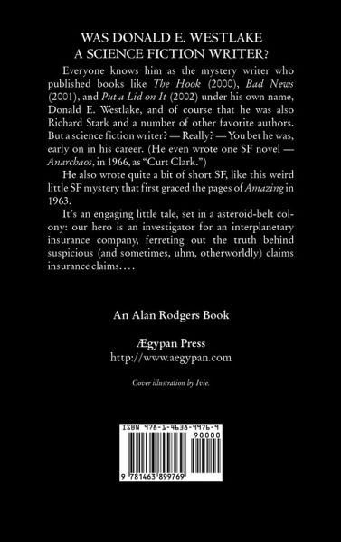 WAS DONALD E. WESTLAKE A SCIENCE FICTION WRITER? Everyone knows him as the mystery writer who published books like The Hook (2000), Bad News 2001, and Put a Lid on It (2002) under his own name, Donald E. Westlake, and of course that he was also Richard Stark and a number of other favorite authors. But a science fiction writer? -- Really? -- You bet he was, early on in his career. (He even wrote one SF novel -- Anarchaos, in 1966, as "Curt Clark.") He also wrote quite a bit of short SF, like this weird little SF mystery that first graced the pages of Amazing in 1963. It's an engaging little tale, set in a asteroid-belt colony: our hero is an investigator for an interplanetary insurance company, ferreting out the truth behind suspicious (and sometimes, uhm, otherworldly) insurance claims. . . .
